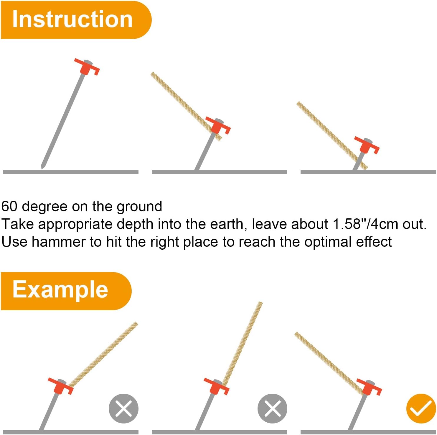 - 【Tent Pegs Instructions】Put the stake at a 60-degree angle on the ground and insert it into the ground, leave about 1.5 inches out. Use hammer to hit the right place to reach the optimal effect.