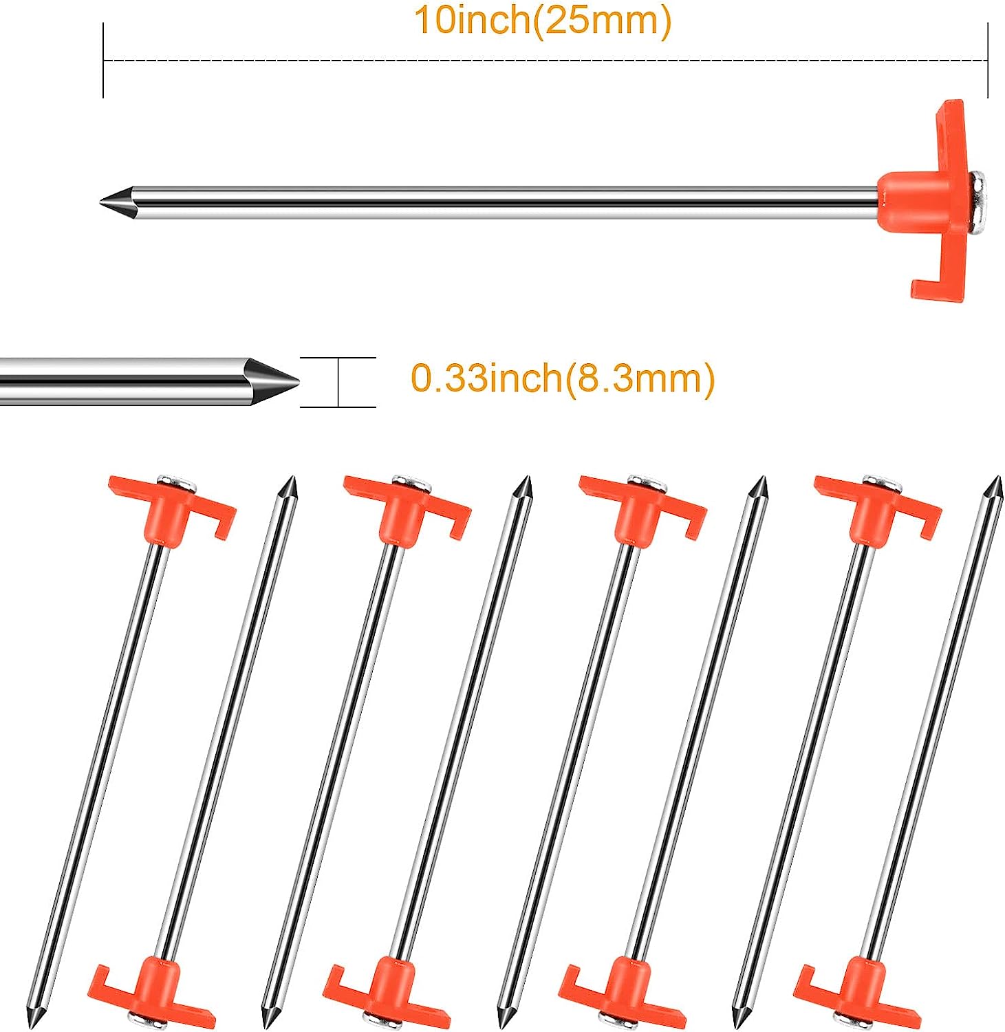 - 【Set Includes】Package with 8-pack ground stakes. The heavy duty tent stakes are 10inch/25cm long,can hold target deeper and stronger. Approx. 0.33in ( 8.3 mm ).designed and tested to hold strong without bending or failing.